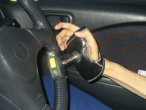 ハンドルを回すための旋回装置です。ハンドルを握れないために、画像のように手をハンドルに固定してしまいます。これで問題なくハンドルを回す事が出来ます。