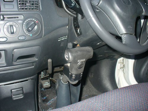 手動装置です。アクセル・ブレーキ・ホーン・ウィンカー・ハザード・ライトの切り替えなどはここで行います。前に押すとブレーキ、手前に引くとアクセルです。