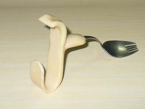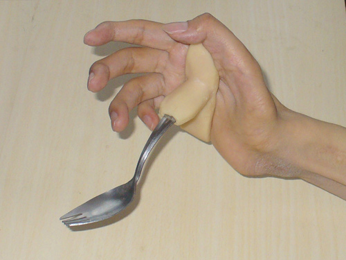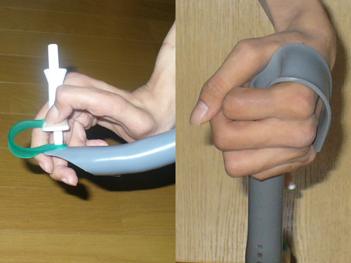 このスプーンはその当時使っていたもので、手のひらに通して使用するものです。現在は使用していませんが、指が動かない頚髄損傷者はこのような感じで食事をしています。また、カフというバンドを手に差し込み、そこにスプーンやフォークを付けて食事する、という自助具などもあり、こちらの方がいろいろと活用場面が多いかもしれません。