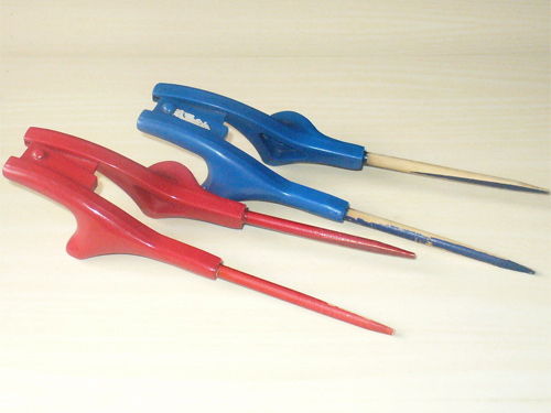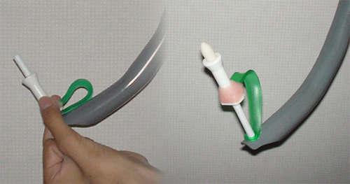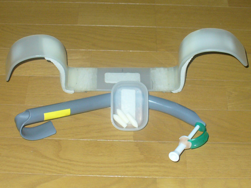 自力で排泄が出来ないため、レシカルという座薬を使用して便を出します。肛門からレシカルを挿入するとガスが発生します。そのガスの力で便を出します。しかし、レシカルを指で持って入れるという動作が出来ないので、このレシカル挿入器を使用します。こういった物を使用することで排泄は一人で可能になりました。白い部分(画像真ん中)にレシカルをセットして、股の間を通して肛門に入れます。肛門が見えないので、2~3個レシカルが便器の中に落ちてしまったりとなかなか難しいです。