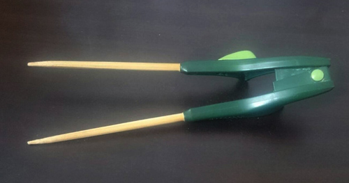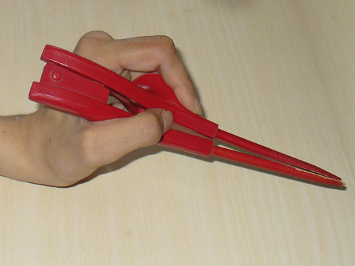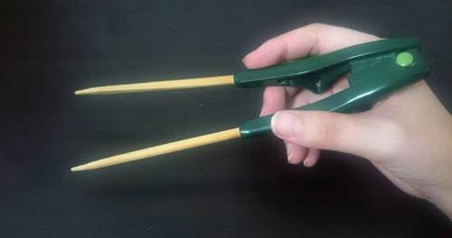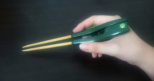 これは普段使っている箸です。箸蔵くんと言います。本当にそういう名前なんですよ。私は左利きですが、右利き用でも使えます。背屈したときに少しでも握る力があれば使用可能だと思います。箸を広げてくれるのは内蔵されているバネの力なので、広げる動作が出来なくても大丈夫です。子供の箸の持ち方も良くなるそうです。機会があれば、ぜひ使ってみてください!新しいバージョンの箸蔵くん2がオススメです。