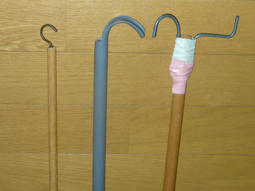 リーチャーです。ハンガーに掛かっている洋服を取ったり、遠くのものを手繰り寄せたりするときに使用します。先端部分がフックになっていて、このフックに物を引っ掛けて、落ちている物を拾ったり遠くの物を手繰り寄せたりします。
