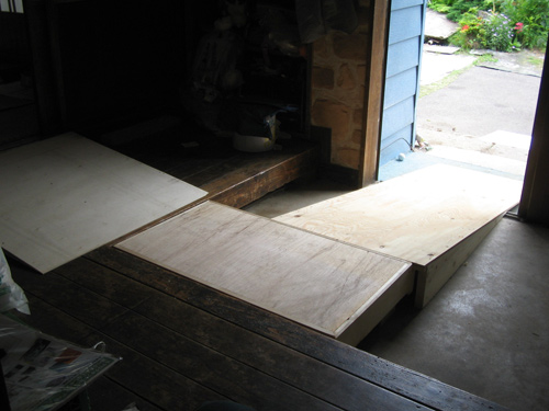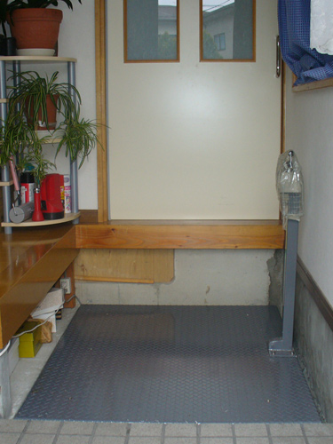 設置場所が確保出来るのであれば、段差の問題はスロープを設置することで解決することが出来ます。左の画像のスロープは、取り外しが可能な簡易スロープです。大工さんに1万円で作ってもらいました。