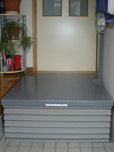 左の画像は段差解消機をアップした時とダウンした時の画像です。下から上までは約10秒で到達します。逆に上から下までは約8秒です。この解消機の上で家用車椅子に乗り換えます。外履きから上履きに履き換える感じです。安全のために手すりが付いていたんですが、逆に不便なので外してしまいました。
