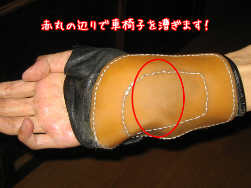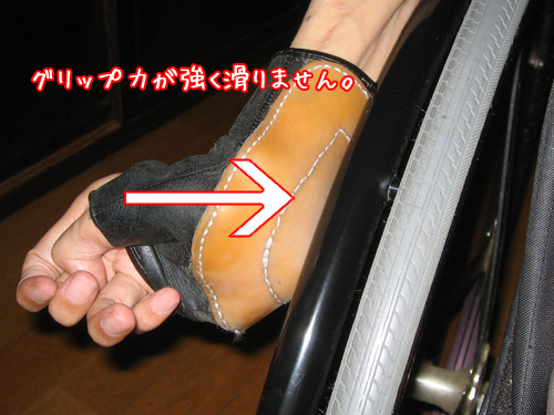 頚損で指が動かない場合、車椅子を前に進めるために、ハンドリムを握って漕ぐという動作が出来ません。その場合、手の平でハンドリムを扱がなければなりません。しかし、汗をかかない手の平は乾燥していて、ハンドリムを漕ごうとしても滑ってしまいます。これでは力が伝わらずに車椅子が進みません。そんな時は力を伝えるためにグローブを使用します。このグローブが何かと便利です。